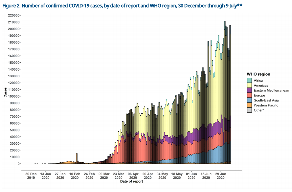 The above chart shows the number of COVID-19 cases, starting all the way back in December. As you can see, the number of cases in the Americas – primarily the United States – continues to rise, as states continue to report record numbers of new cases in the past few weeks. At the date of this writing, there is a total of over 3,000,000 cases in the United States alone, with over 132,000 deaths. Those numbers are staggering and frightening, and should not be discounted.