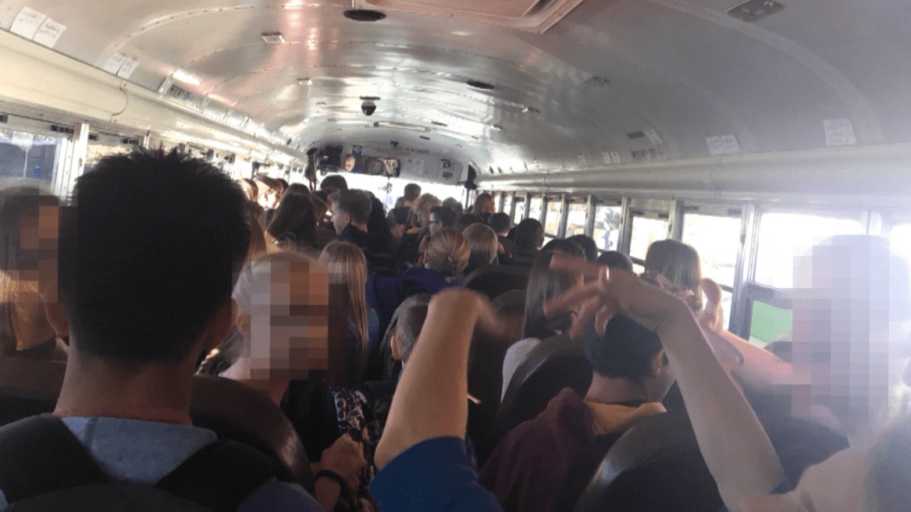 School buses are another place where students are far more likely to be exposed to the virus. Approximately 26 million children use school buses as their form of transportation to and from school each day, and in recent years there have been numerous reports about overcrowding on buses taking place (like in the image above).