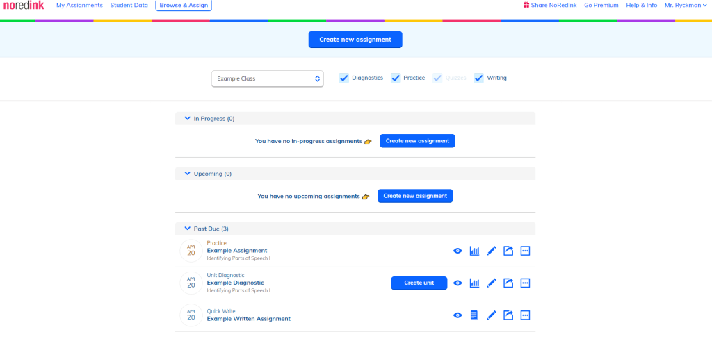 NoRedink is a handy supplemental tool for teaching and assessing grammar. You create a class – in which there are multiple options for adding the students, including importing from Google Classroom – and set up assignments for them to work through. Assignments are broken up into sections, and students have to answer multiple questions in a row correctly in order to progress to the next section. This prevents students from just blowing through the assignment blindly – they have to take things seriously!